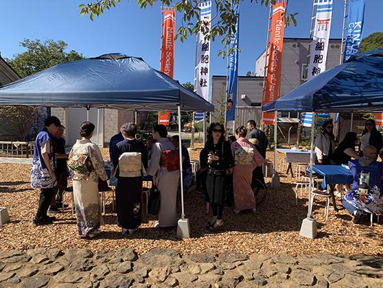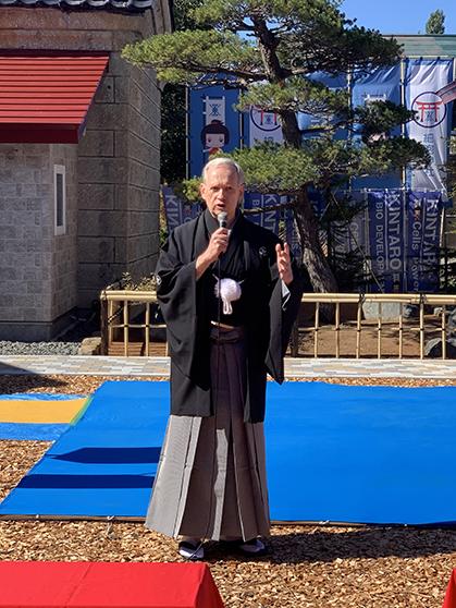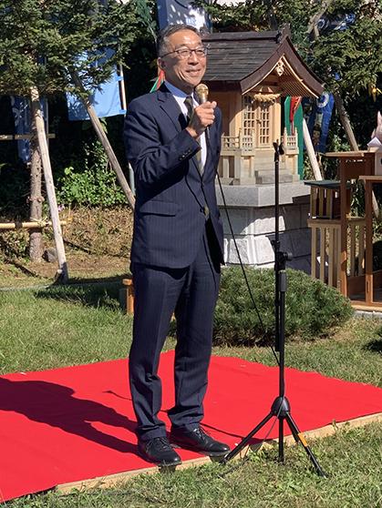 Continuing from last year, many guests came from Japan and Southeast Asia to participate this year as well. First, Kintaro officials gathered for a purification ceremony conducted by the chief priest of Sumiyoshi Shrine in front of the Shinto altar. Then, the main ceremony began in the precincts of the cell shrine with the participation of all those present, and our representative, Mr. Gradkov Alexei, performed the service. On the stage there was a dedicatory kagura performance and sumo song by former sekitori (sumo wrestler) Daishi-san. Mayor Toshiya of Otaru City Mr. Hazama also attended the event and gave a speech.