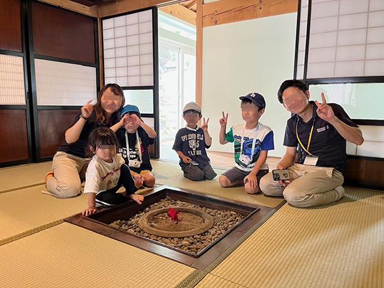 After visiting the Cell Shrine, the children seemed very interested in the laboratory, which was built in a repurposed stone storehouse. They took a break for snack time in Old Folk House, which is part of reconstructed area of Kintaro Research Center. Everyone enjoyed a relaxing time in the tatami room. We hope it will become a fun memory for them during their summer vacation.