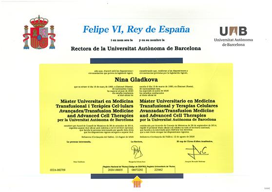 KINTARO Cells Power Medical Director Nina Gladkova, M.D., received her 'Master's Degree in Transfusion Medicine and Advanced Cell Therapy' in recognition of her outstanding research achievements at the University of Barcelona, Spain.