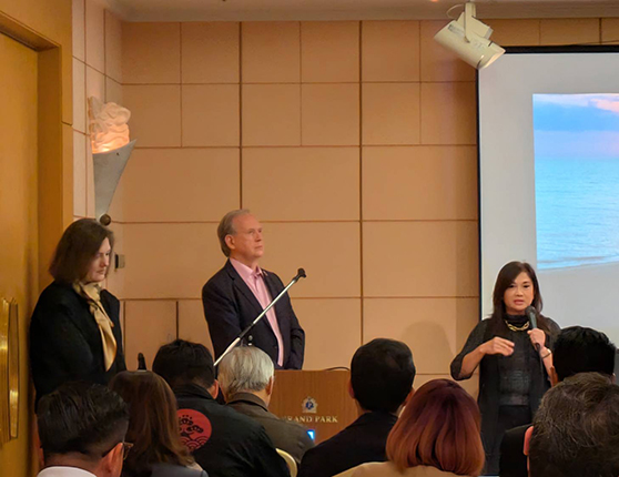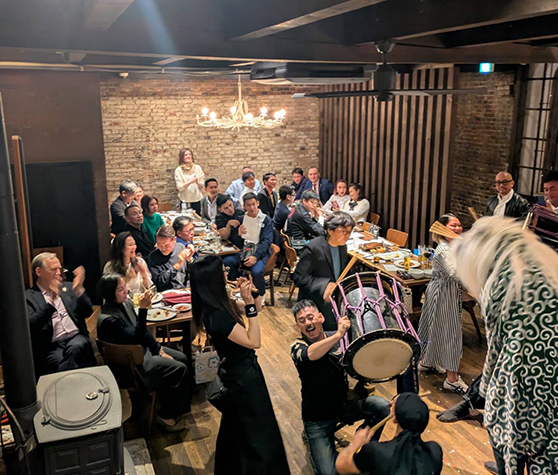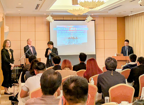 On Monday, October 6, 2025, our company held a briefing for our "Momotaro Vaccine" at Grand Park Otaru. Many attendees were doctors from overseas, including Asian countries, as well as medical agents and coordinators. Dr. Ishio, our medical advisor, gave a presentation in English about the effective cancer treatment "Momotaro Vaccine." Approximately one hour later, the Q&A session began. Many attendees actively asked questions. Dr. Ishio, Dr. Onuma, and our company's president, Alexei Gladkov, answered them carefully and clearly. Following the seminar, a Western-style dinner was held at the hotel. Attendees enjoyed fresh seafood from Hokkaido and A5-grade Ikeda beef steak. Traditional Japanese performances, including lion dances and umbrella spinning, were also performed, creating a lively atmosphere.