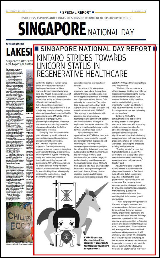 One of the most solid and famous newspaper China South Morning Post published article about Kintaro Cells Power in Singapore Special Business Report o...