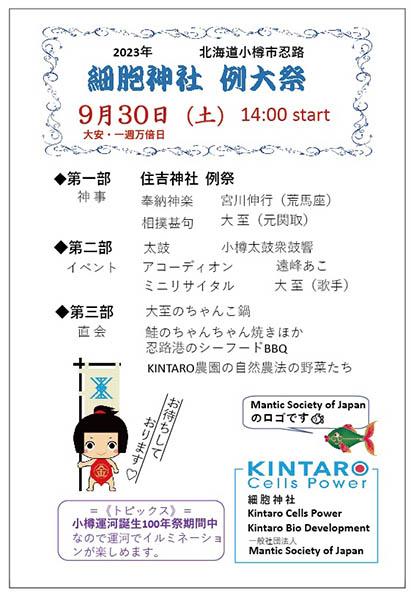 Traditional Annual Festival of Cells Shrine of Kintaro Research Institute in Otaru will be held on 30 September 2023. Every year all our partners and ...