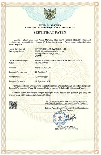 Kintaro Cells Power continues worldwide expansion in intellectual property registration. We received next international Patent. Indonesia Government g...